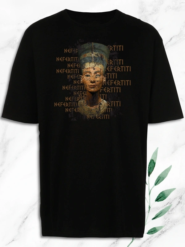 Unisex Siyah Oversize Mitoloji Antik Mısır Kraliçe Nefertiti Baskılı Tişört
