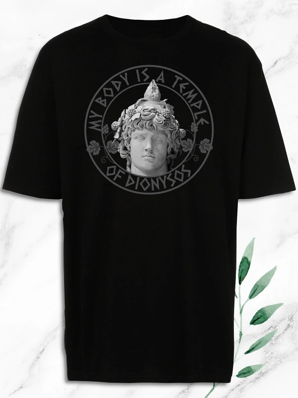Unisex Siyah Oversize Mitoloji Şarap Tanrısı Dionysos Heykel Baskılı Tişört