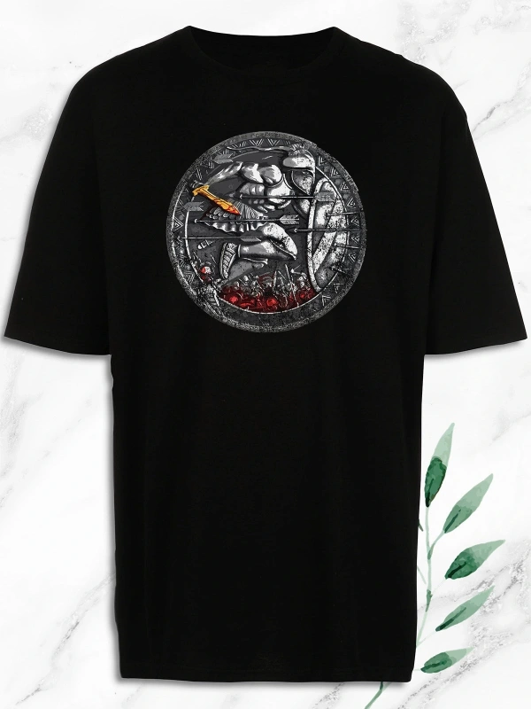 Unisex Siyah Oversize Mitoloji Savaşçı Figürü Baskılı Tişört