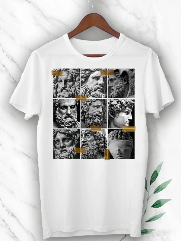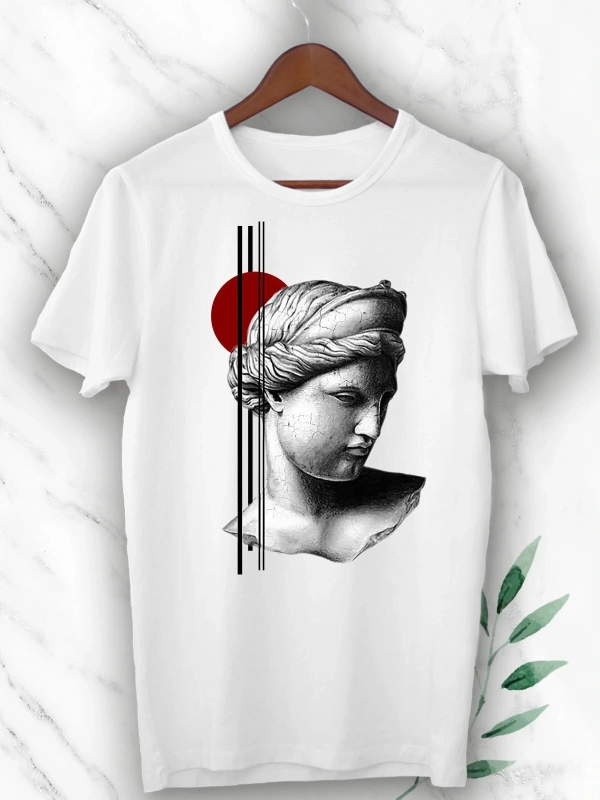 Unısex Beyaz Mitoloji Heykel Baskılı Tişört