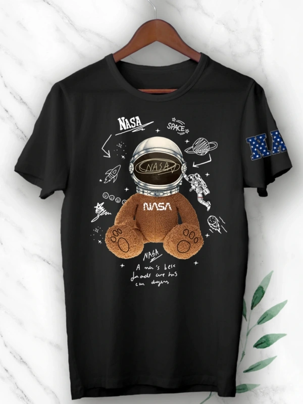 Teddy Bear Nasa Tasarım Baskılı Siyah Tişört