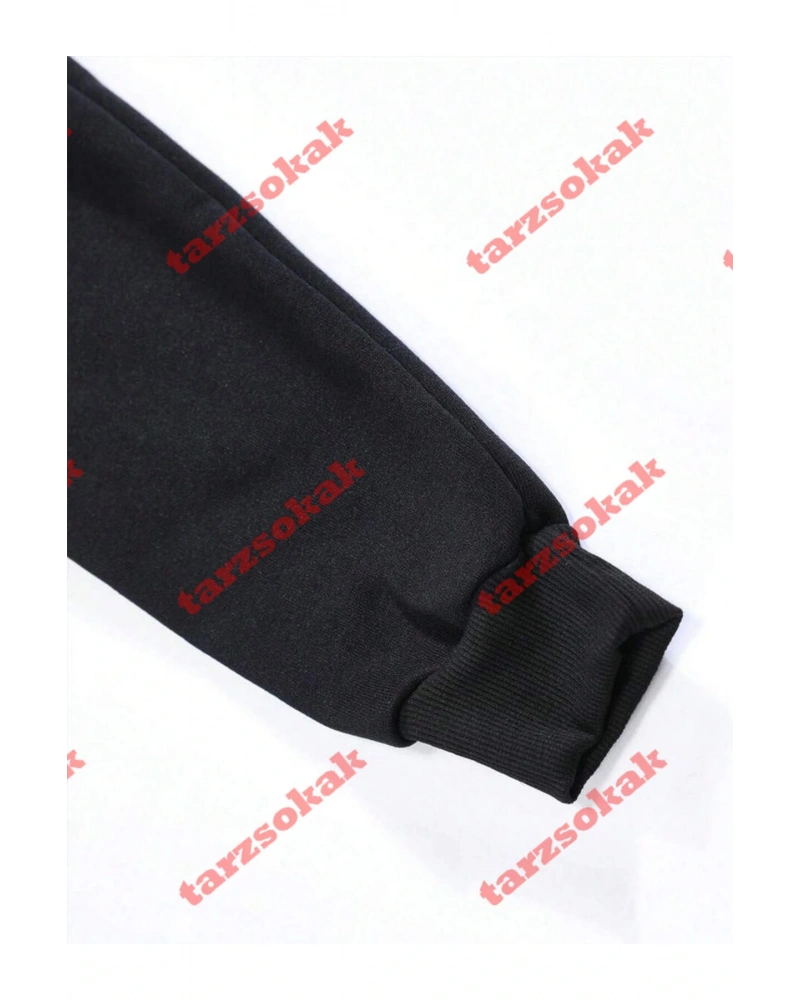 Siyah Yakasız Tüy Baskılı Unisex Sweatshirt