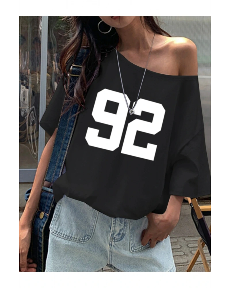 Kayık Yaka 76 Baskılı Oversize %100 Pamuk