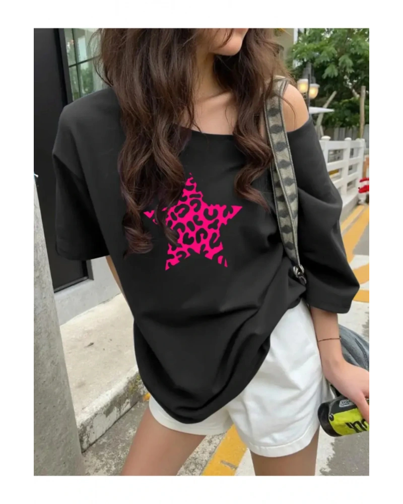 Kadın Düşük Omuz Leopar Yıldız Baskılı Kayık Yaka