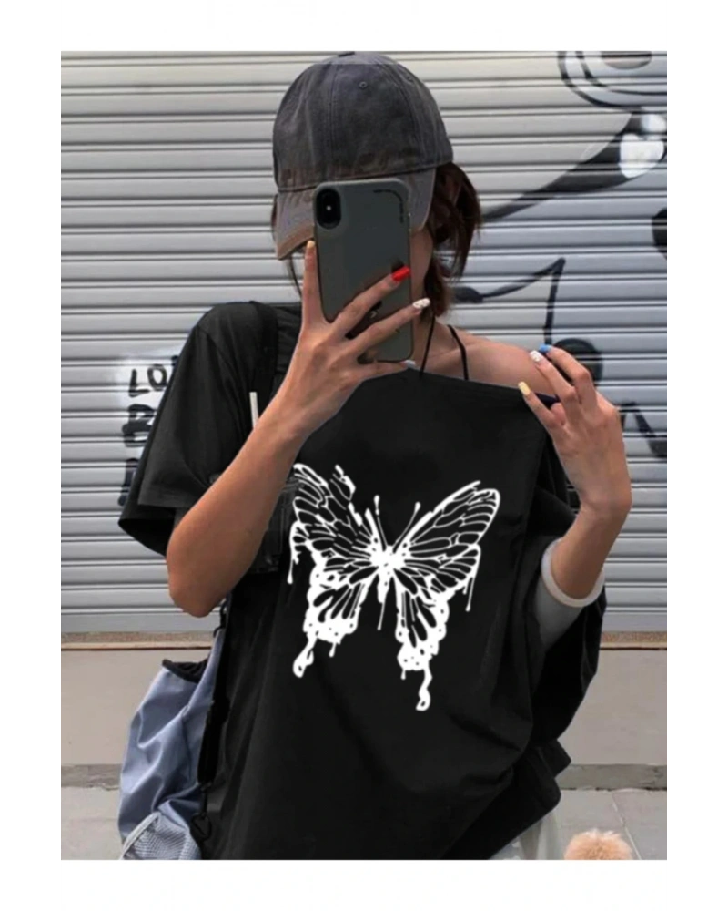 Siyah Kadın Düşük Omuz Kayık Yaka Beyaz Kelebek Baskılı