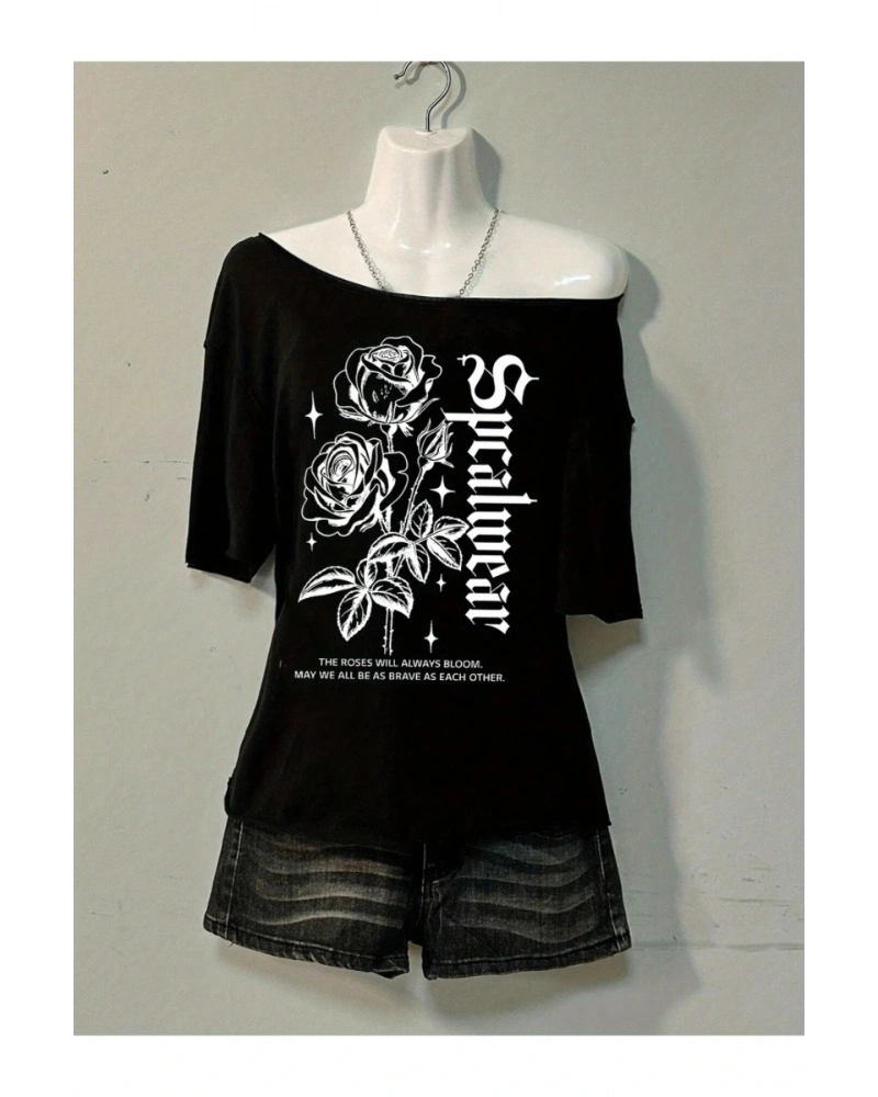 Siyah Kadın Düşük Omuz Kayık Yaka Gül Simgesi Baskılı