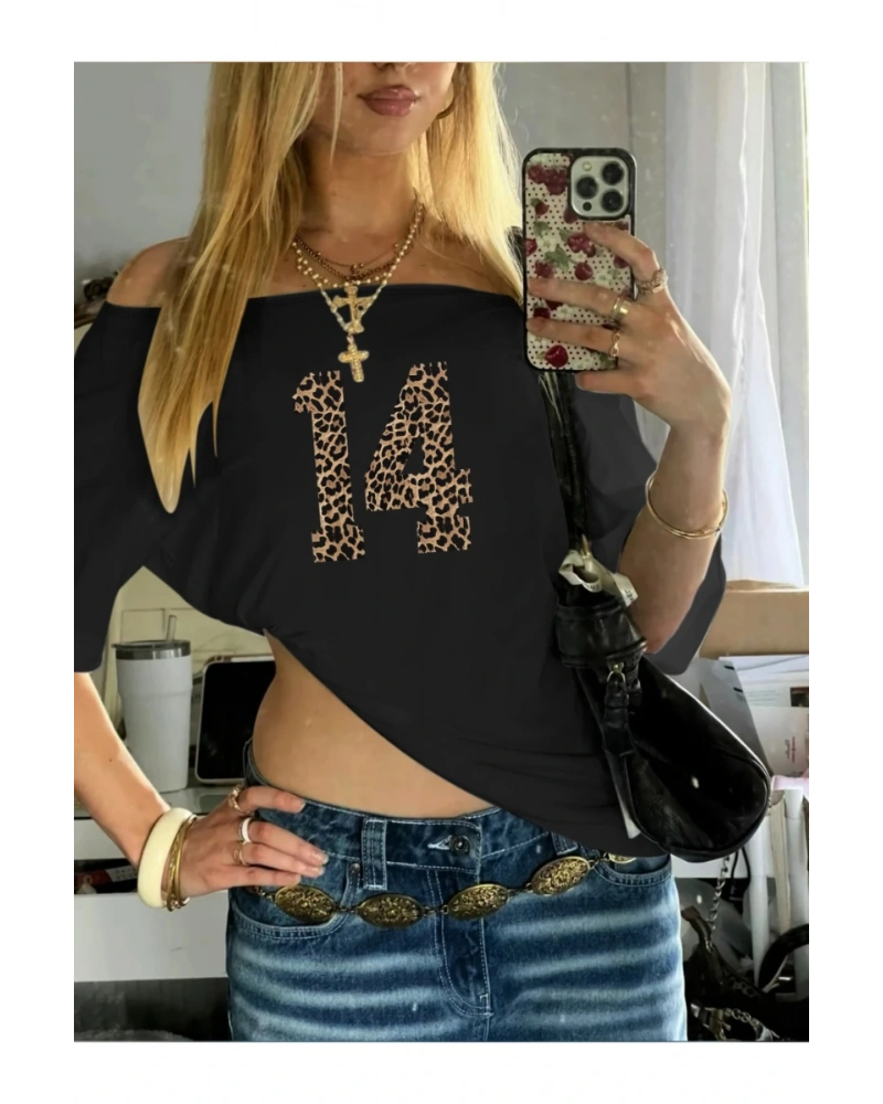 Siyah Kadın Düşük Omuz Kayık Yaka Leopar 14 Baskılı
