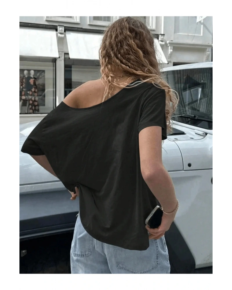 Siyah Kadın Düşük Omuz Kayık Yaka Baskılı
