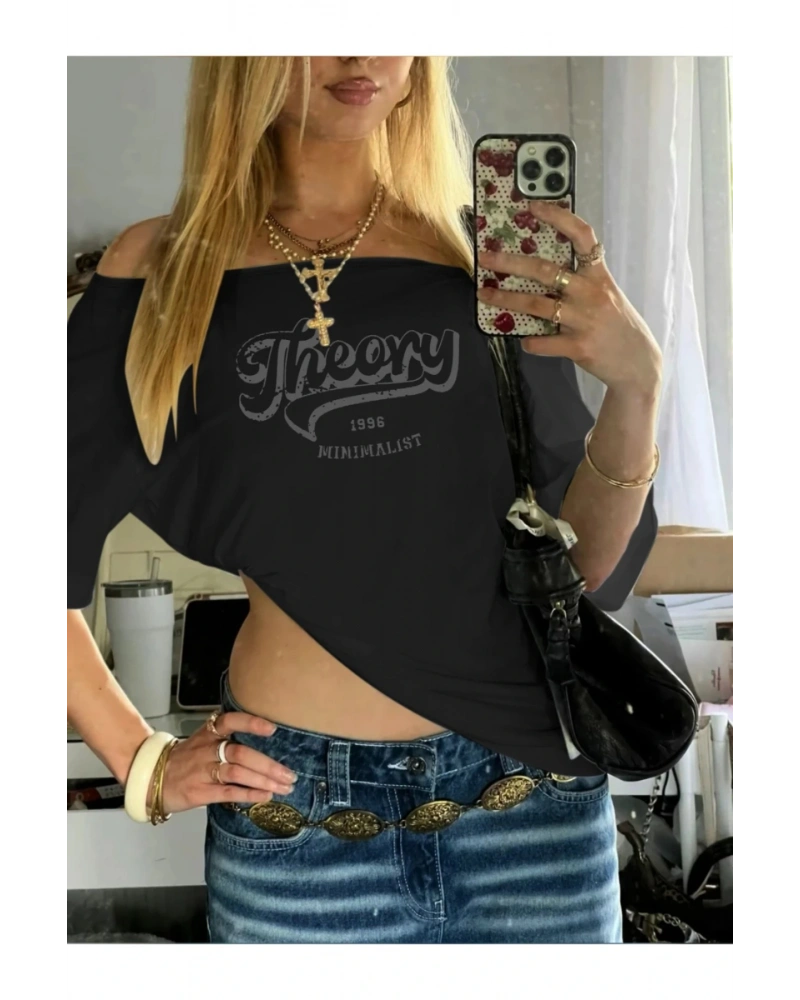 Siyah Kadın Düşük Omuz Kayık Yaka Theory Baskılı