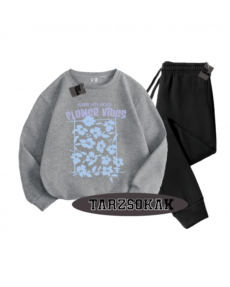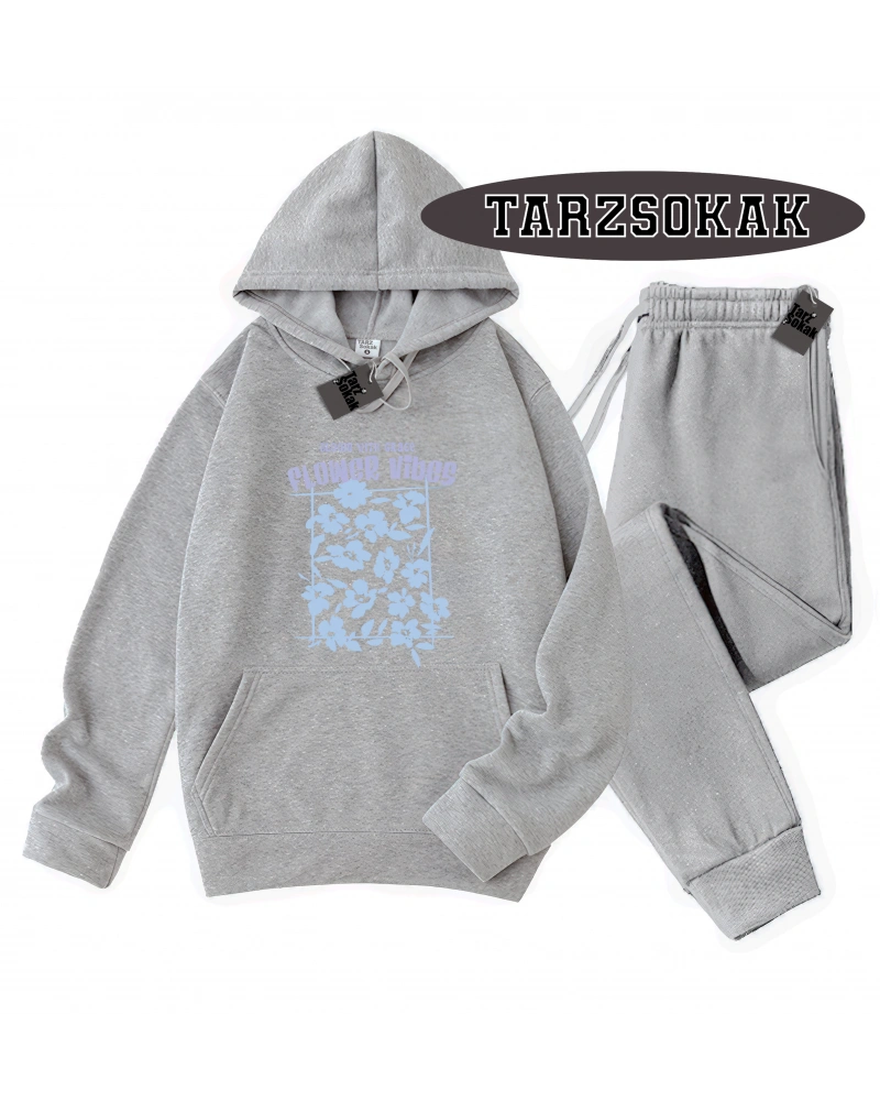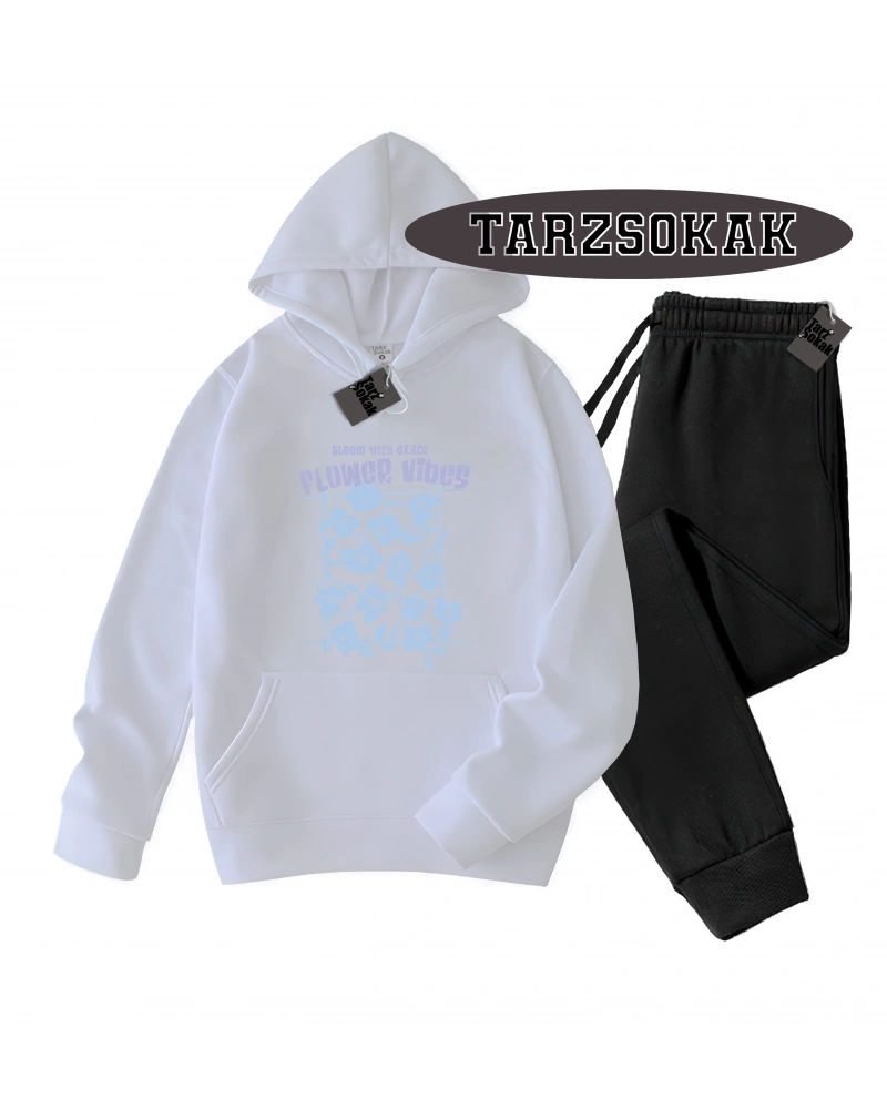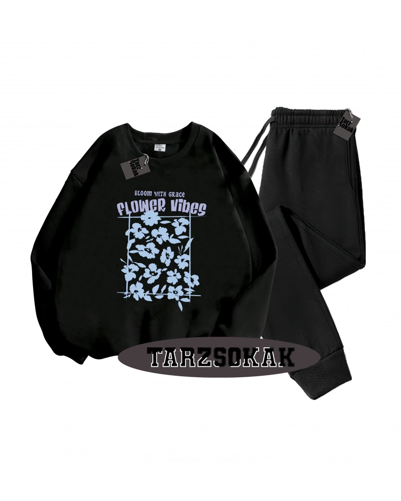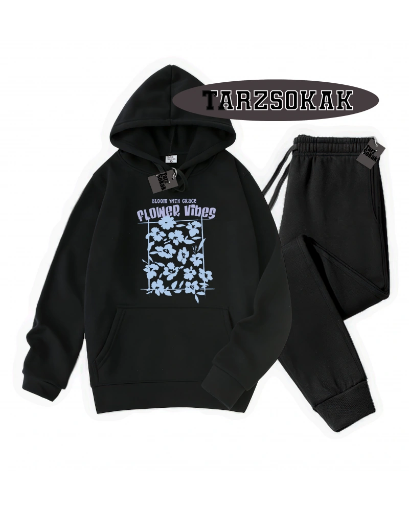 Siyah Kapşonlu Flower Detaylı ikili TAKIM