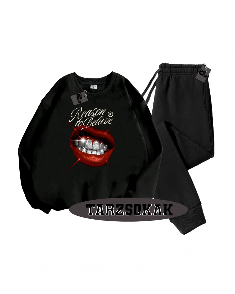 Siyah Kapşonlu RockRoll Detaylı ikili TAKIM