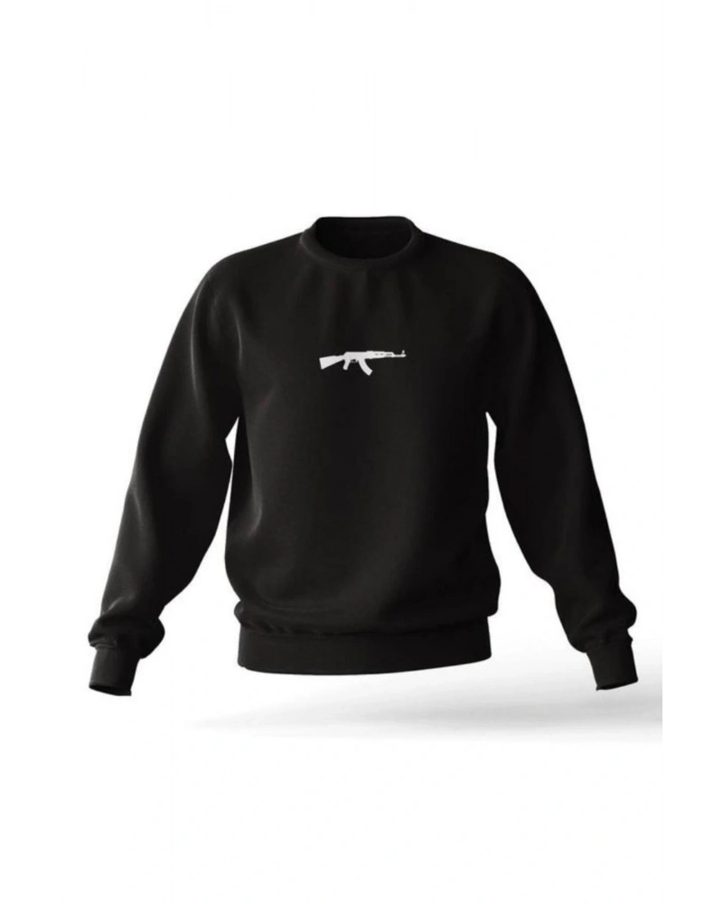 Siyah Kapşonsuz 0 Yaka Ak-47 Baskılı Pamuklu Unısex Oversıze Sweatshirt