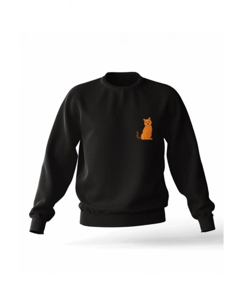 Siyah Kapşonsuz 0 Yaka Kedi Baskılı Pamuklu Unisex Sweatshirt