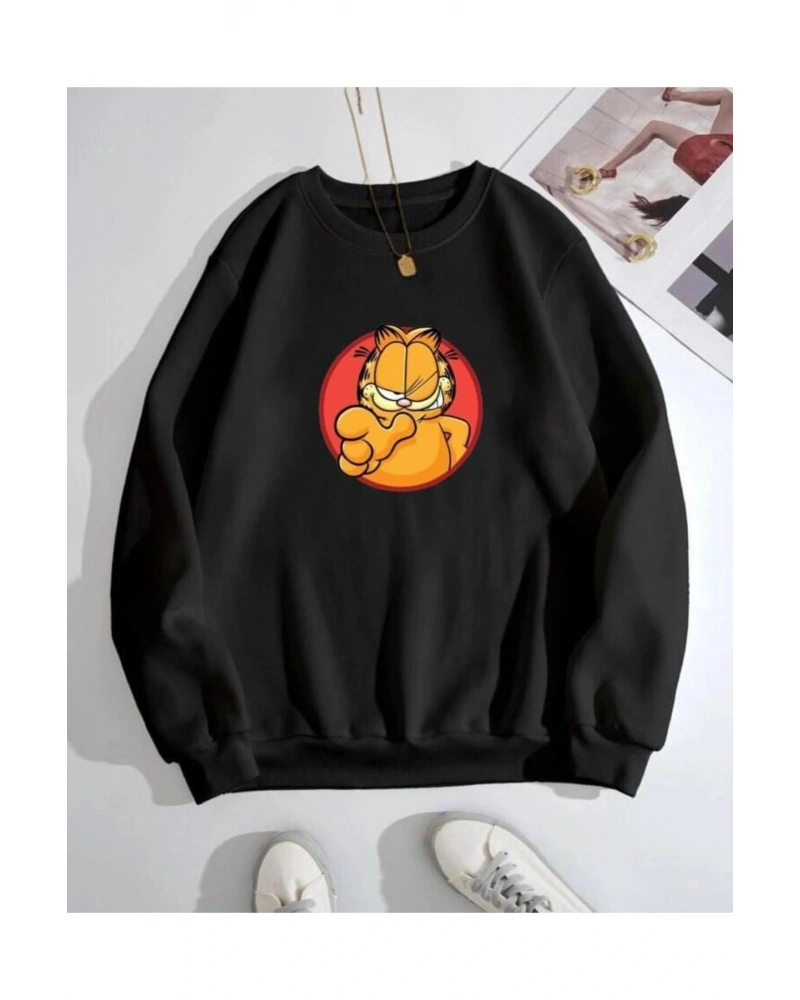 Siyah Oversize 0 Yaka Kapşonsuz Garfield Baskılı Unisex Pamuklu Sweatshirt