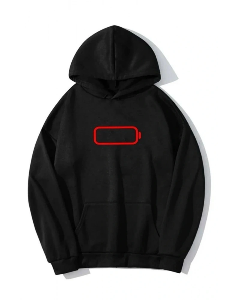 Siyah Oversize Baskılı Pamuklu Kapşonlu Kanguru Cepli Unisex Sweatshirt