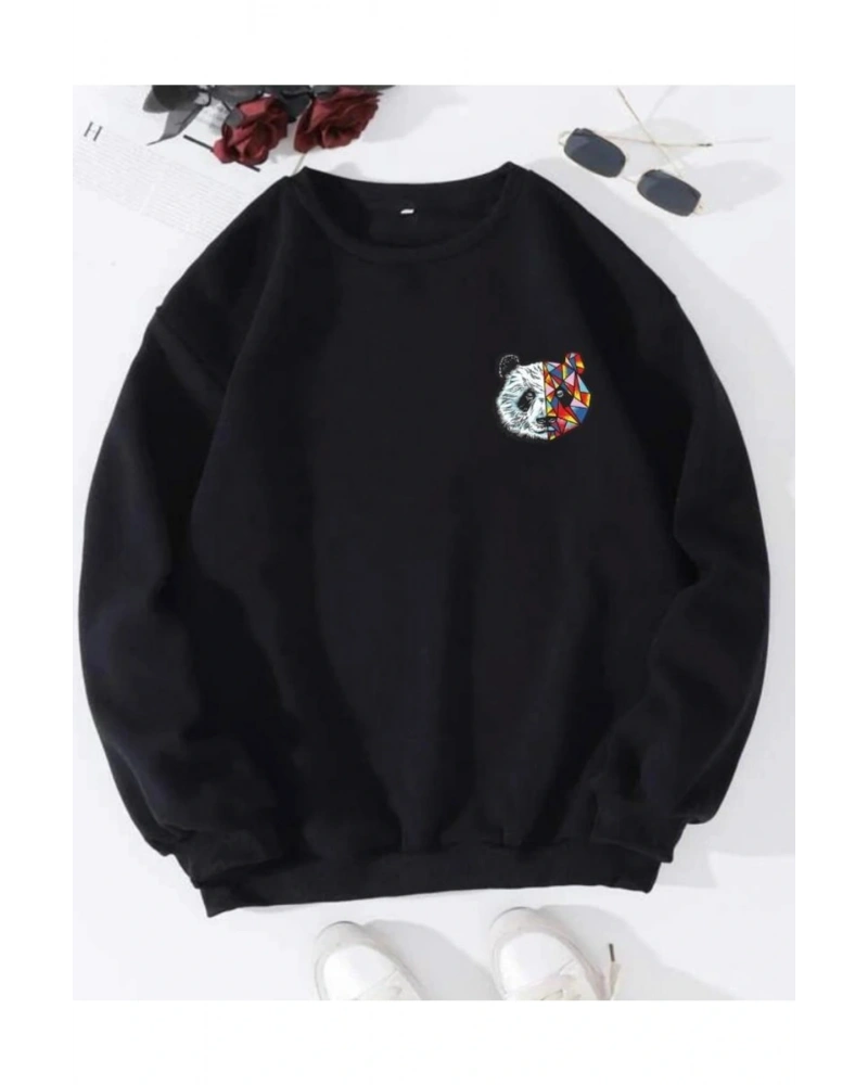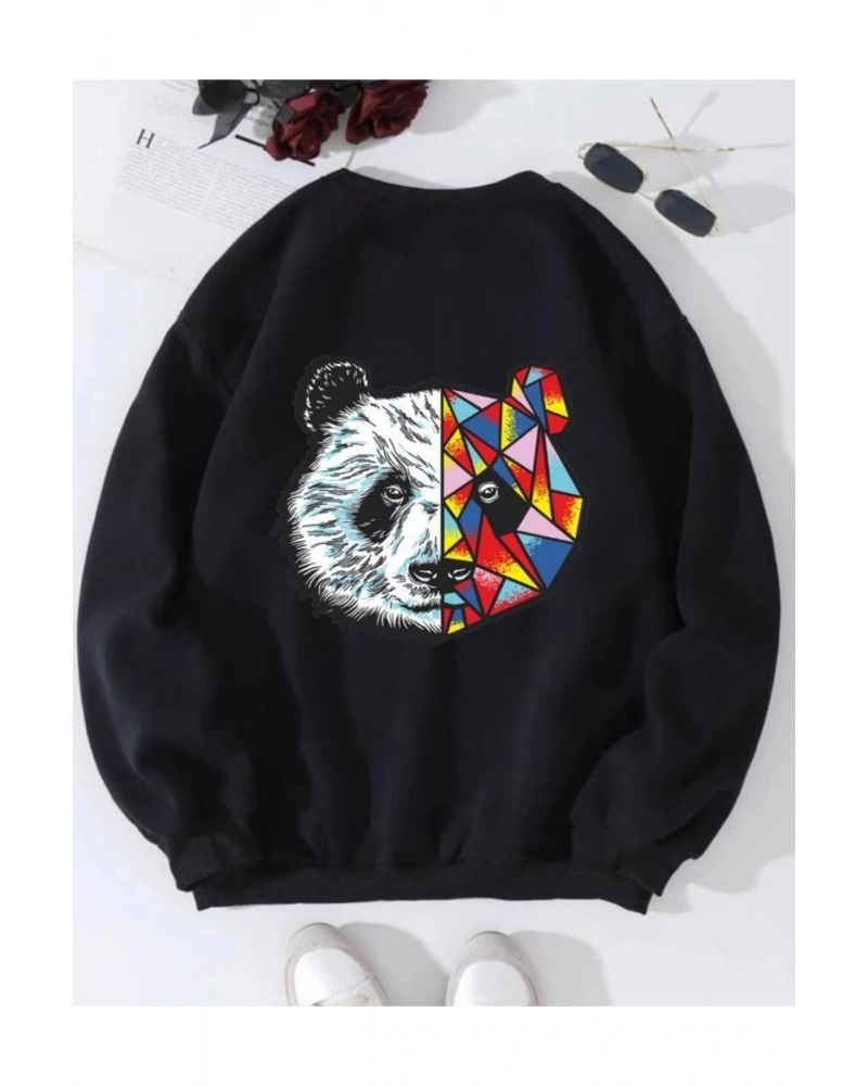 Siyah Oversize Panda Baskılı Pamuklu 0 Yaka Kapşonsuz Unisex Sweatshirt