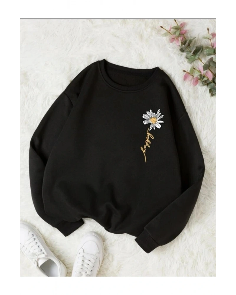 Siyah Oversize Papatya Baskılı 0 Yaka Kapşonsuz Pamuklu Kadın Sweatshirt
