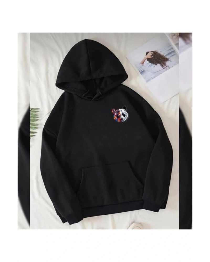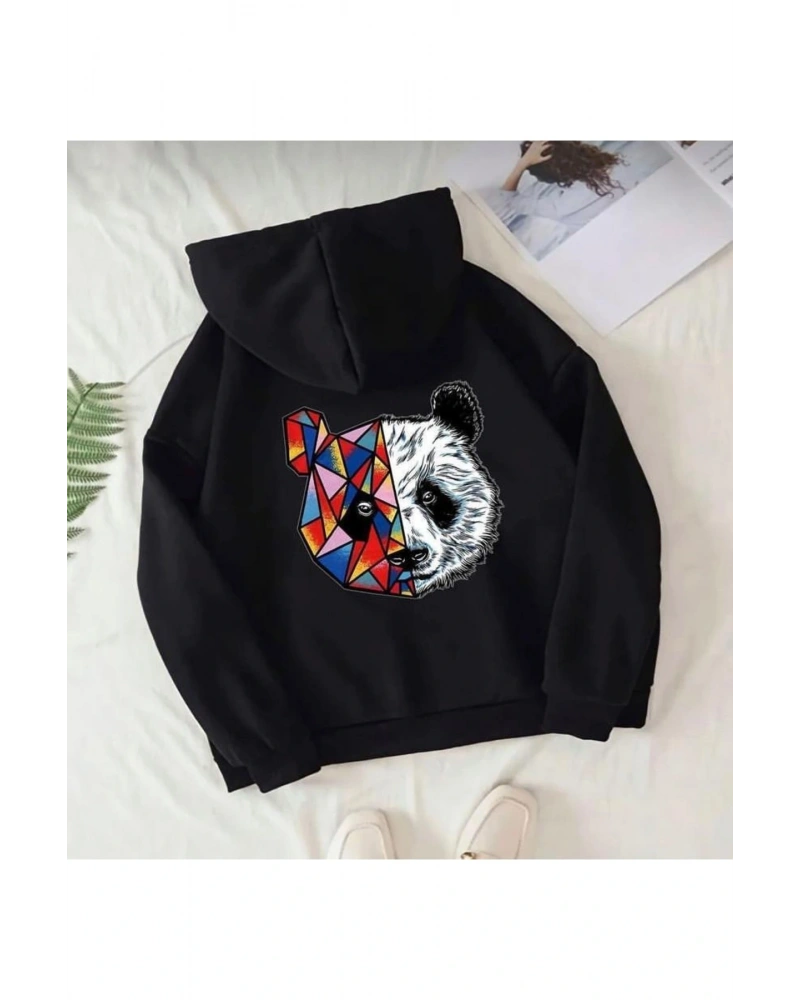 Siyah Oversize Renkli Panda Baskılı Kapşonlu Kanguru Cepli Pamuklu Sweatshirt