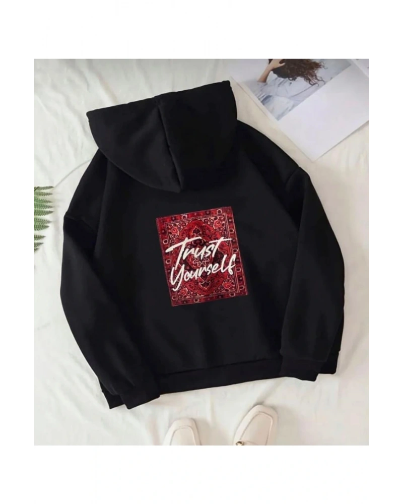 Siyah Oversize Trust Yourself Baskılı Kapşonlu Kanguru Cepli Pamuklu Sweatshirt