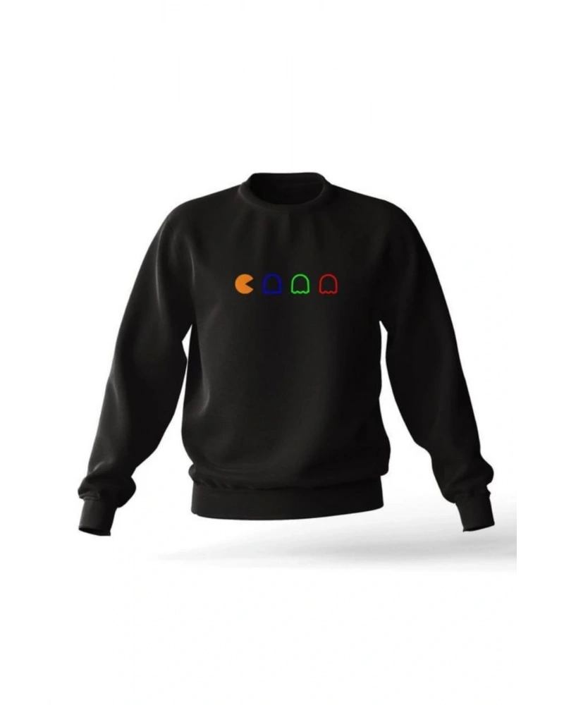 Siyah Oversıze Unisex Pacman Baskılı Pamuklu Kapşonsuz 0 Yaka Sweatshirt