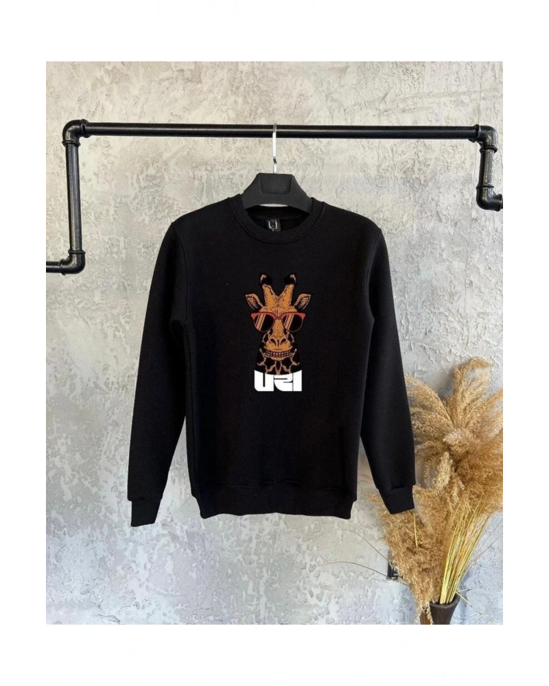 Siyah Oversize Zürafa Baskılı Kapşonsuz 0 Yaka Pamuklu Unisex Sweatshirt