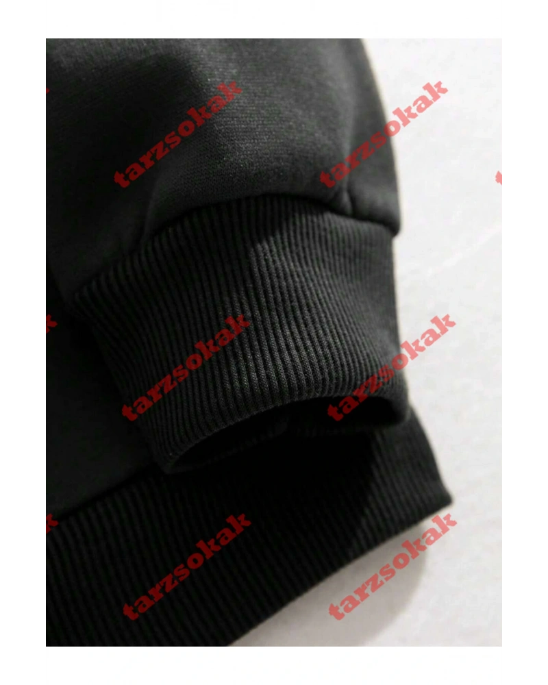 Siyah Yakasız Tüy Baskılı Unisex Sweatshirt