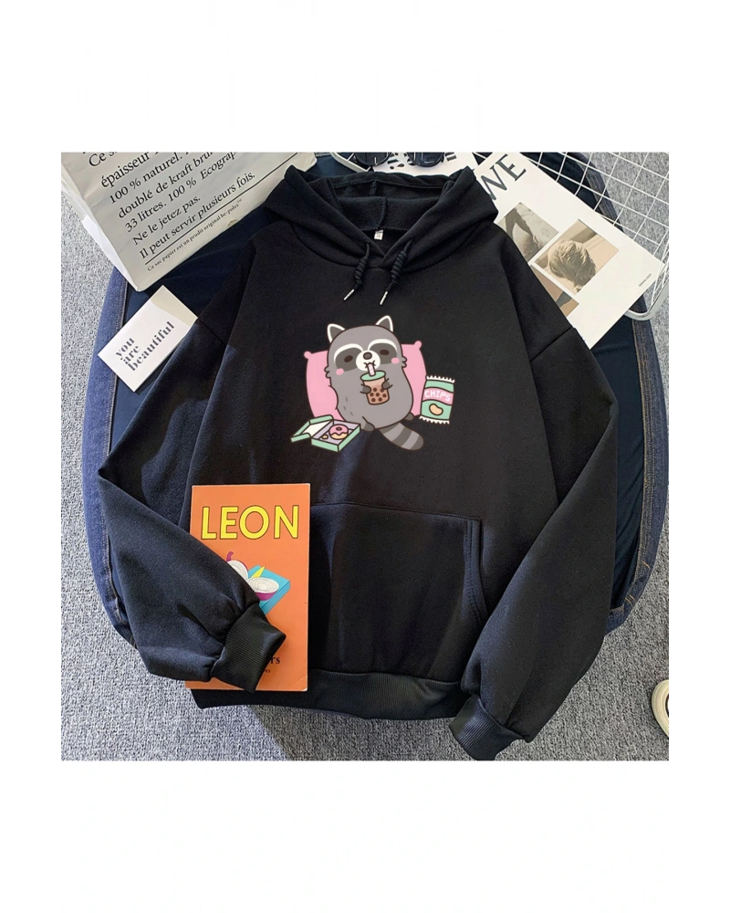 Siyah Sevimli Rakun Yeme Kabarcık Süt Çay Hoodies Rahat Kawai