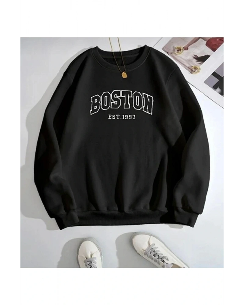 Siyah Unisex Boston Baskılı 0 Yaka Kapşonsuz Pamuklu Sweatshirt