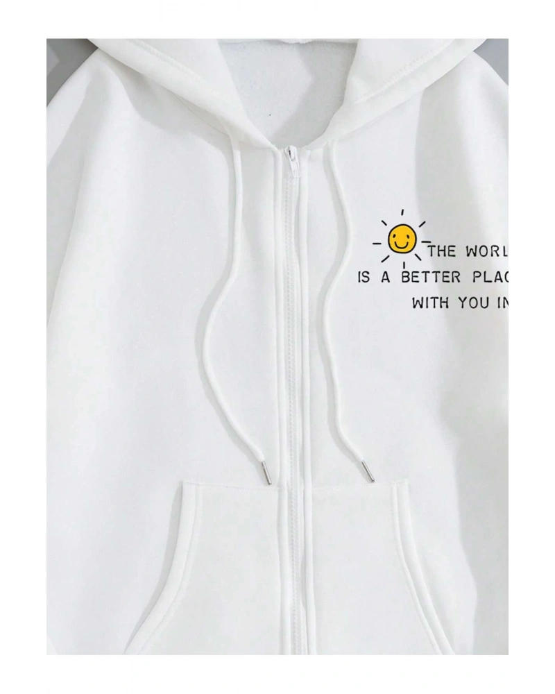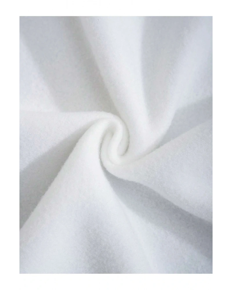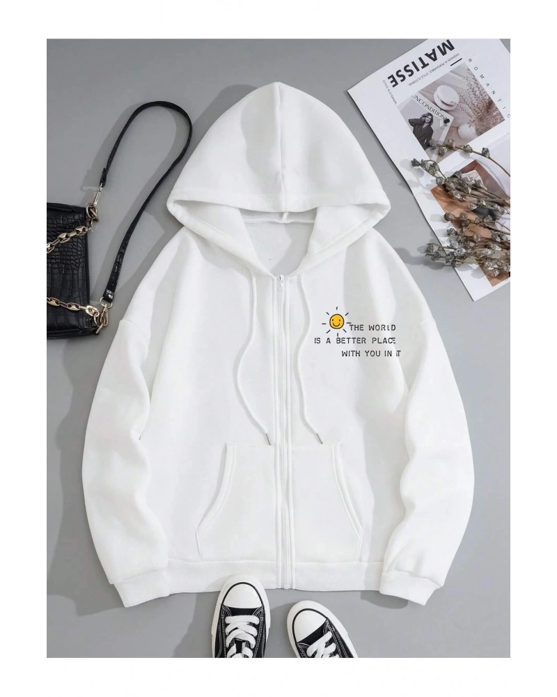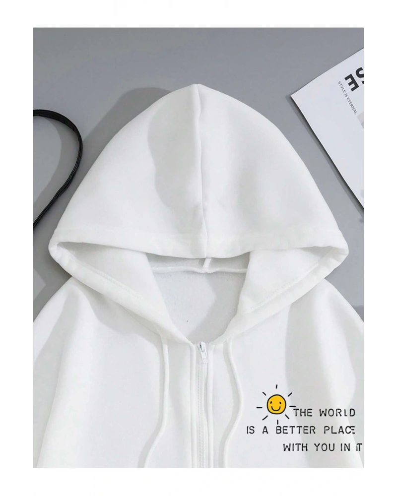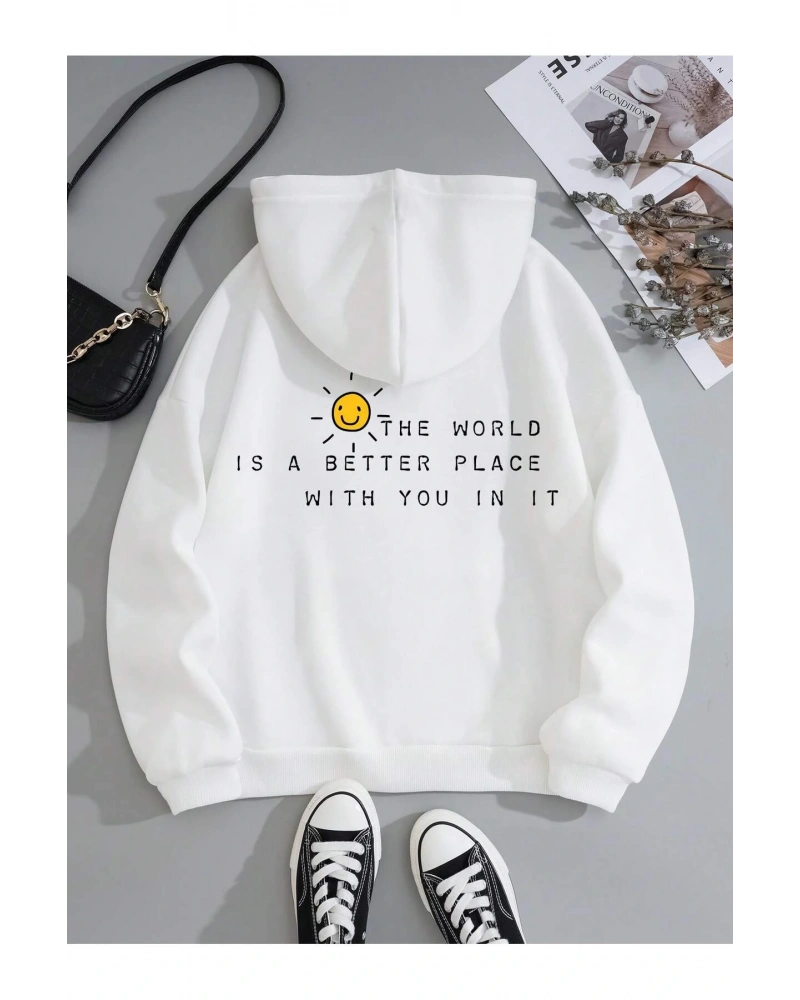 Slogan Graphic Drawstring Lined Kangaroo Pocket Hoodie Beyaz