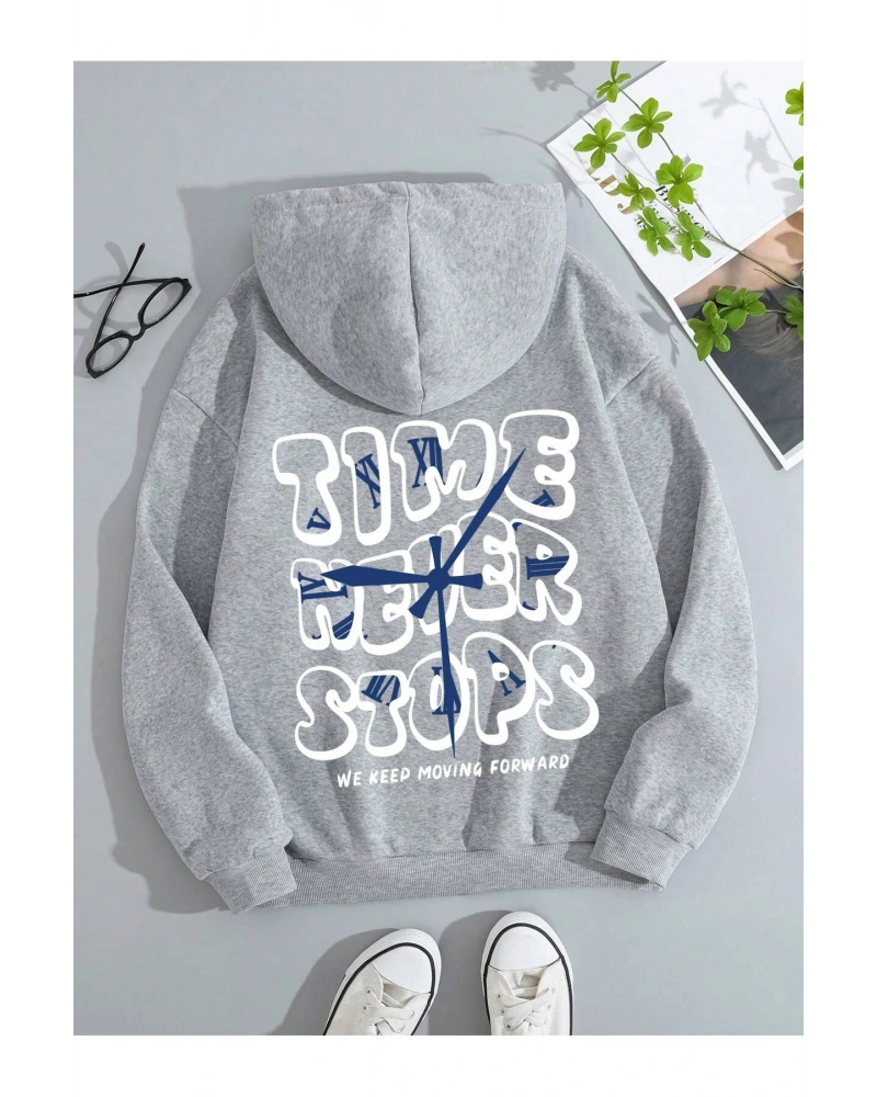 Sloganlı Grafik İpli Kapüşonlu Üst Gri