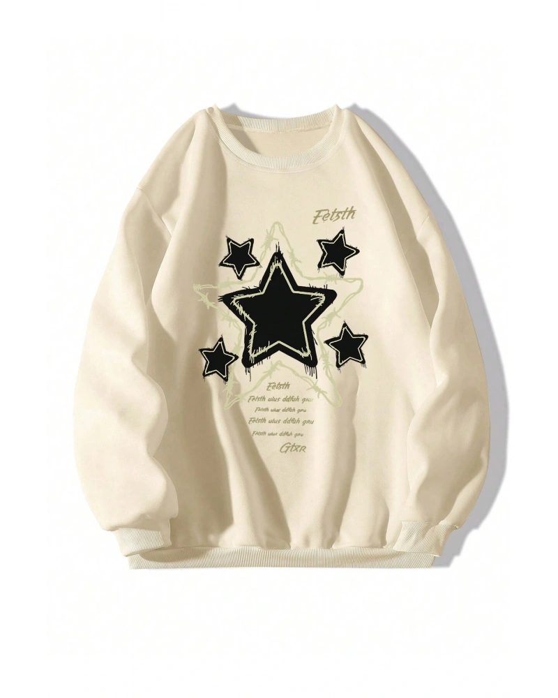 Sloganlı ve Yıldız Desenli Düşük Omuzlu Oversize Sweat Bej