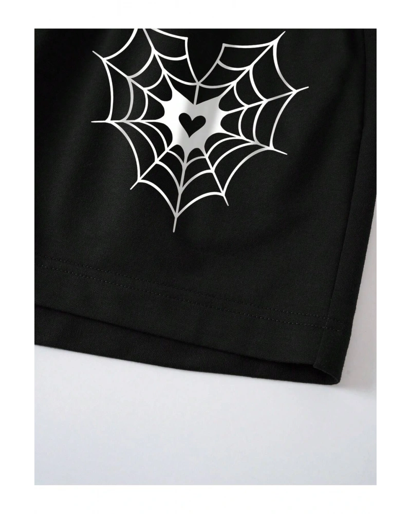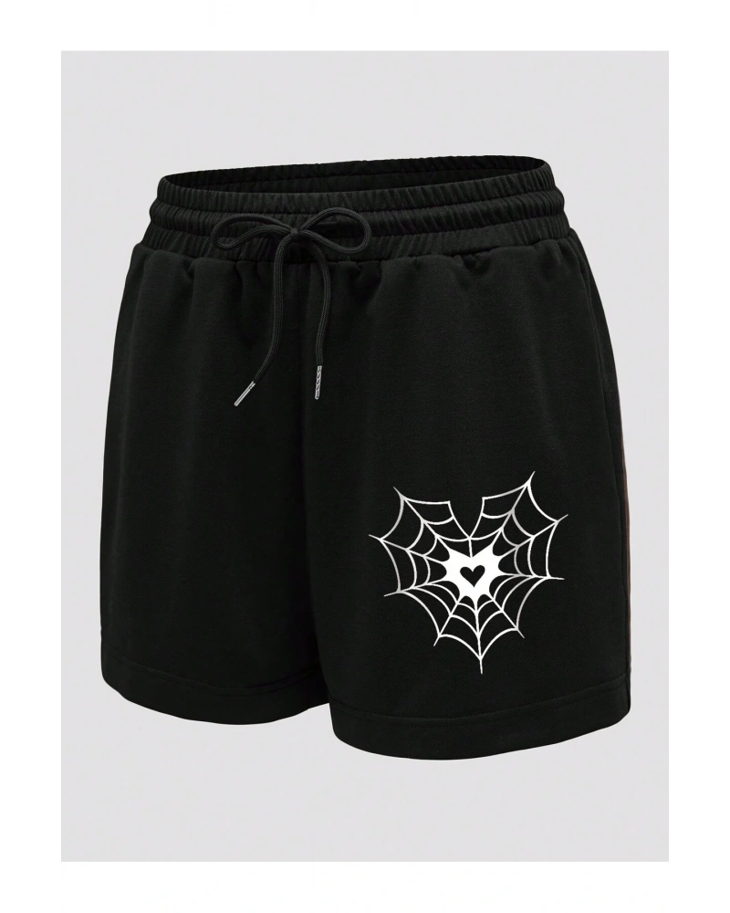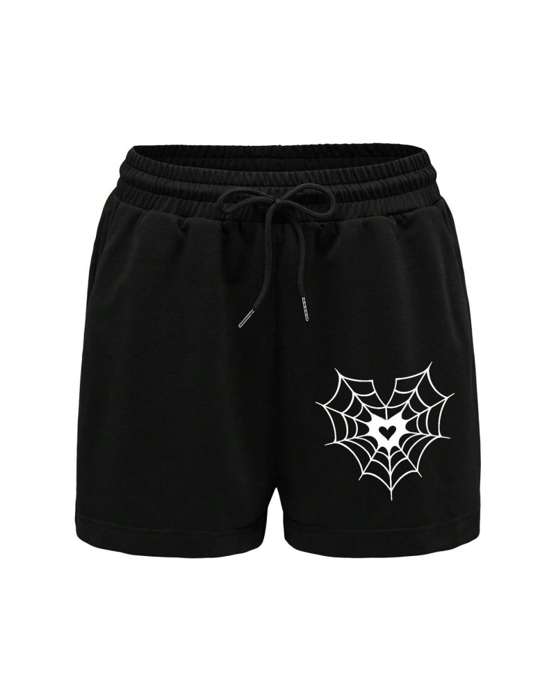 Spider Web & Heart Print Drawstring Waist Şort
