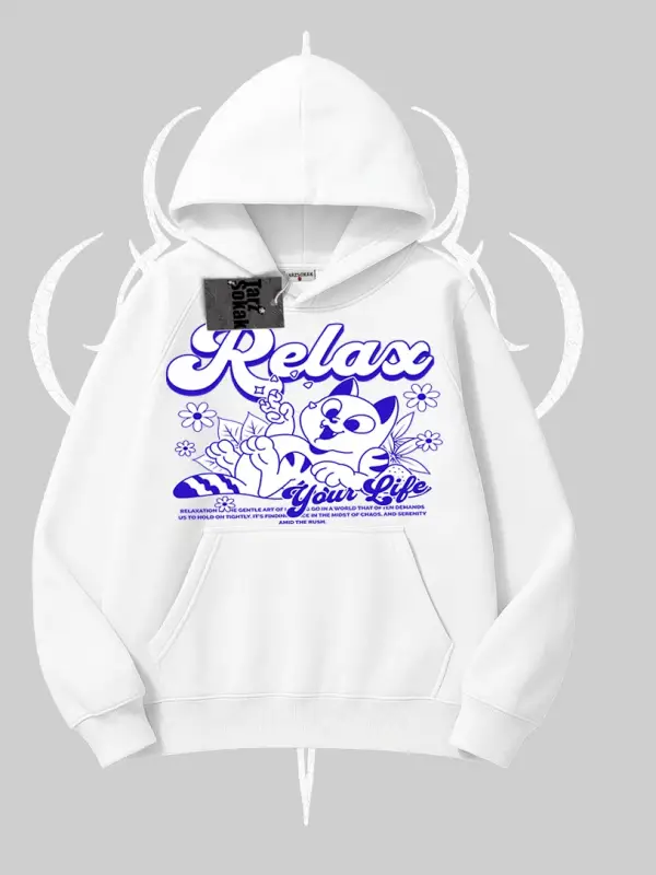 Relax Kedi Baskılı Kapşonlu Sweatshirt