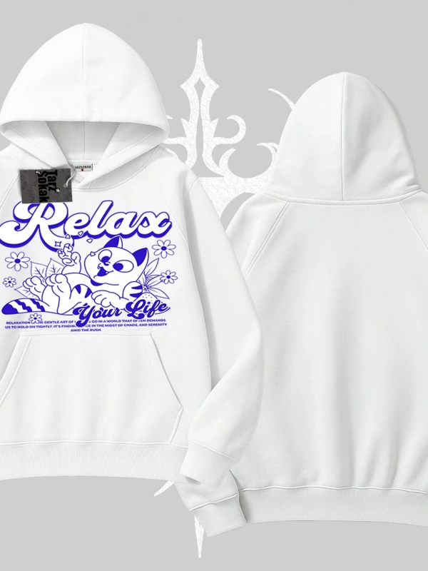 Relax Kedi Baskılı Kapşonlu Sweatshirt