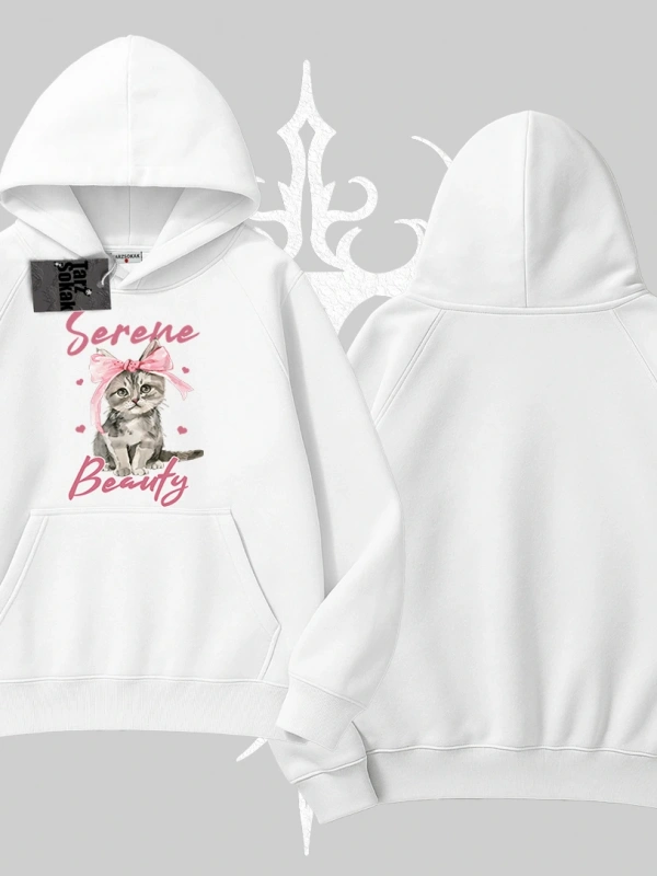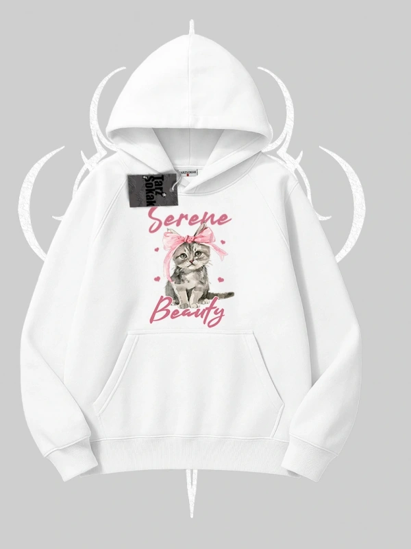 Serene Beauty Kedi Baskılı Kapşonlu Sweatshirt
