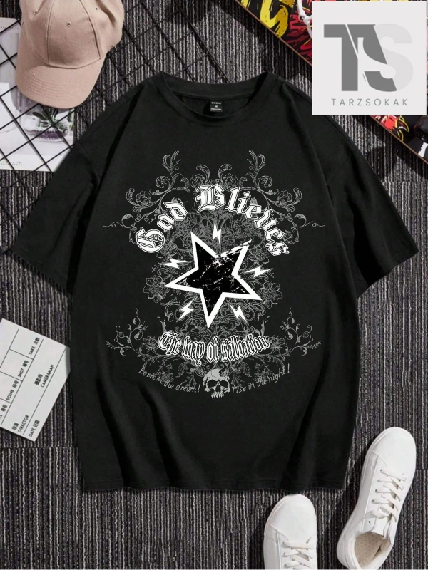 Erkek Örümcek ve Harf Baskılı Düşük Omuz Kollu Tişört