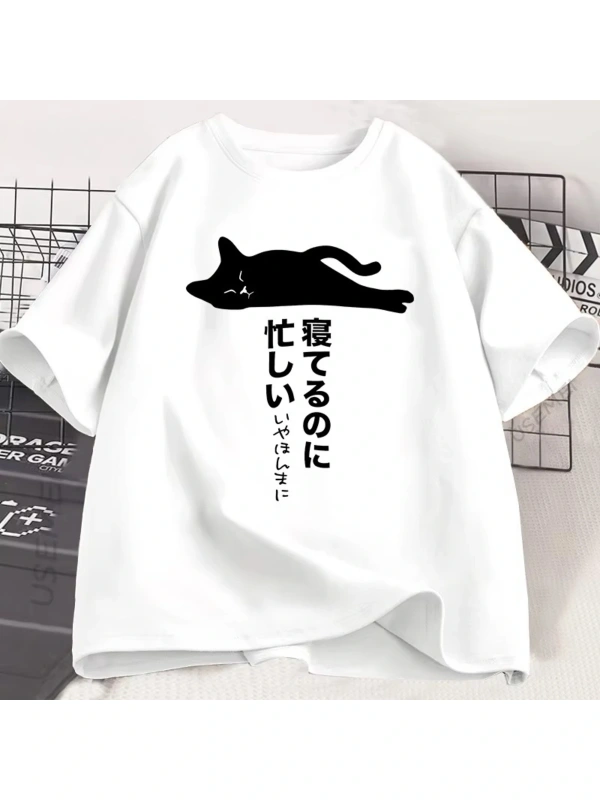 Beyaz Komik Tembel Kedi Japon Sokak T Yuvarlak Boyun Tee Ret