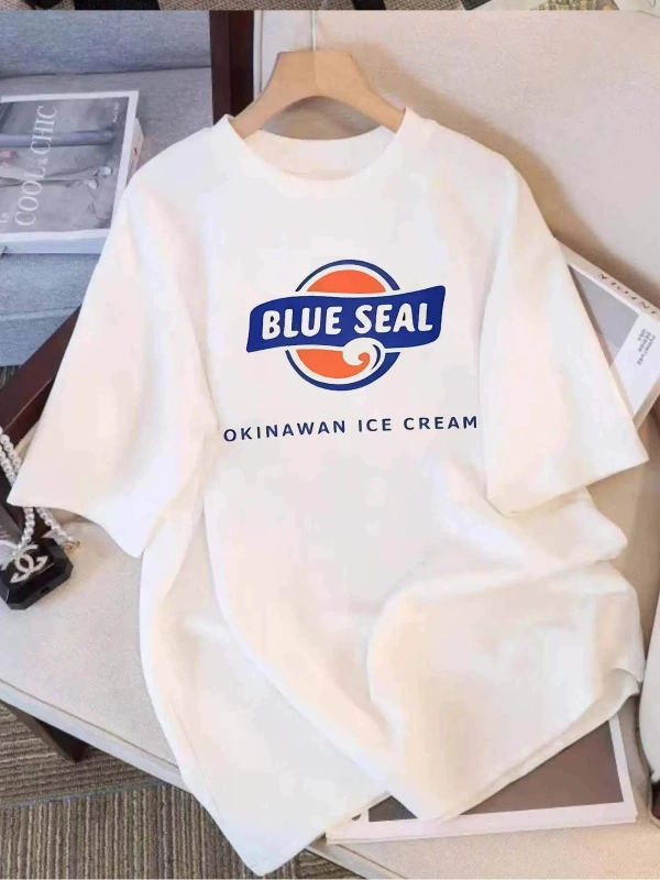 Beyaz Yaz Mavi Mühür Karikatür Baskı Yuvarlak Boyun Sevimli Y2K Stilleri Ra
