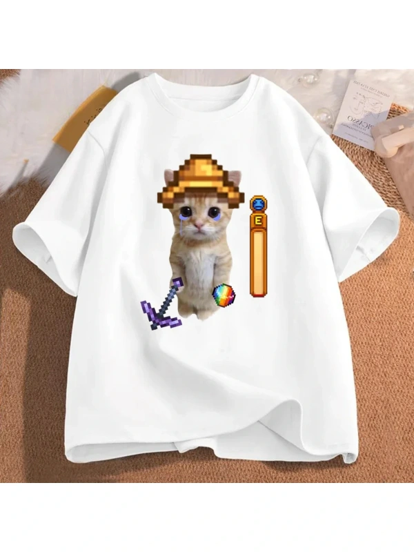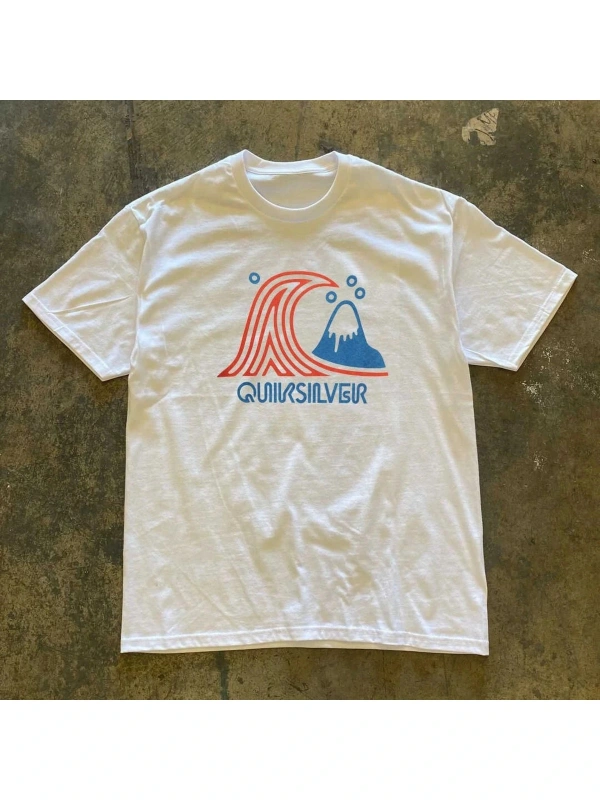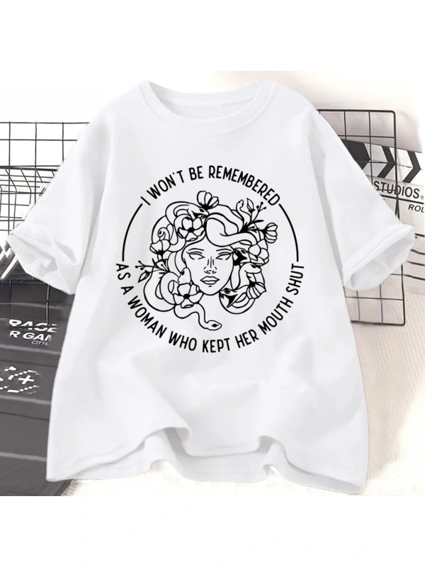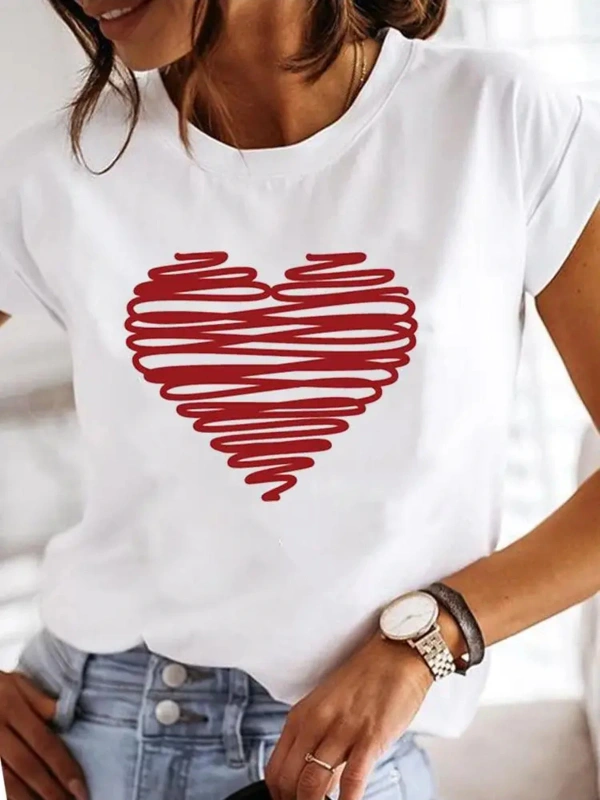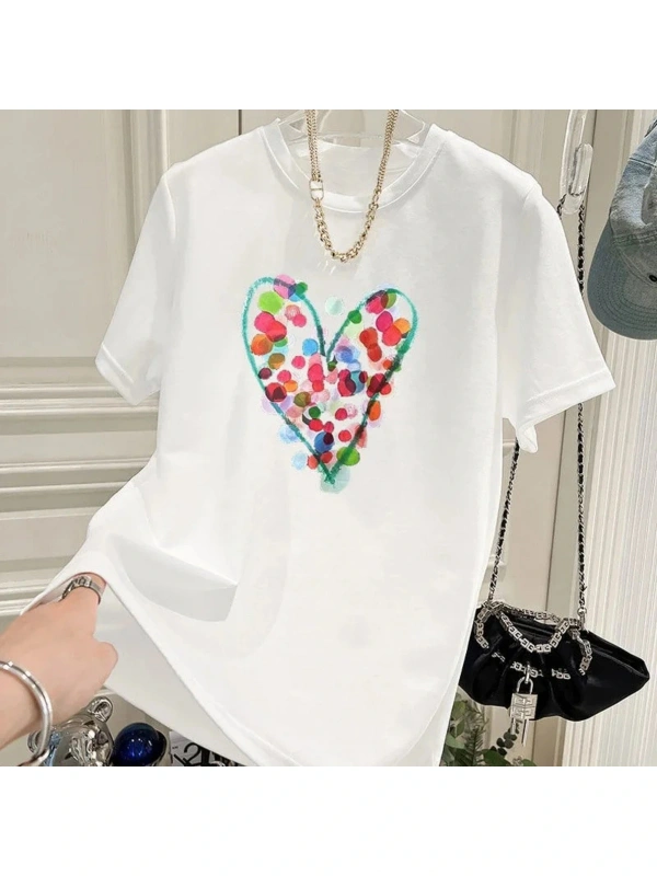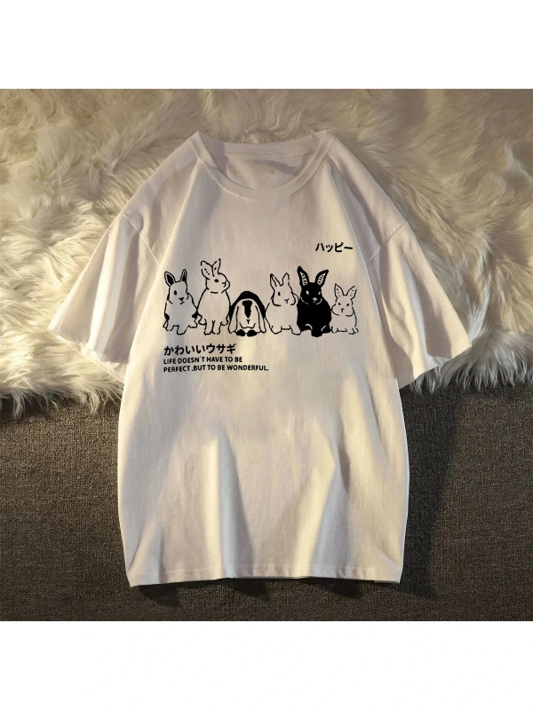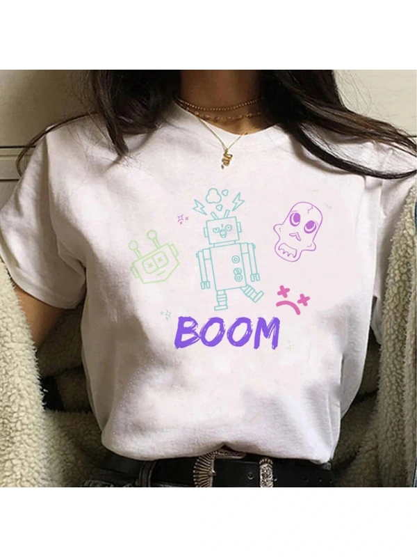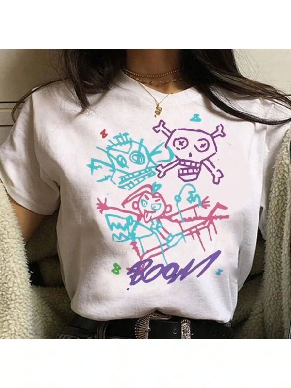 Beyaz Trend Yuvarlak Boyun Gevşek Yaz Grafik Yaz
