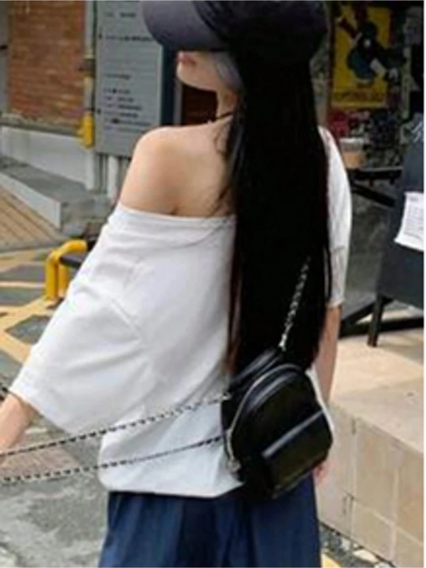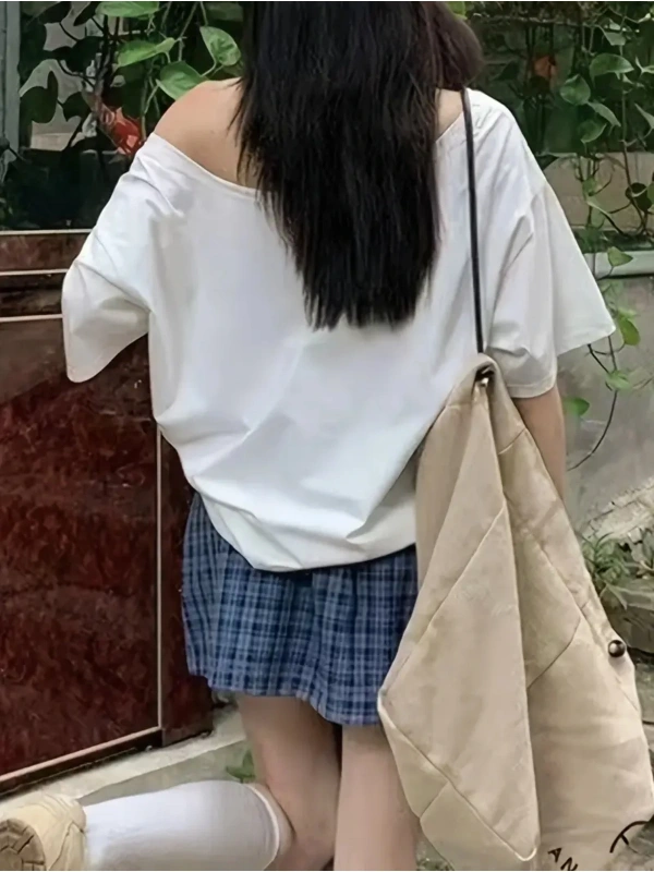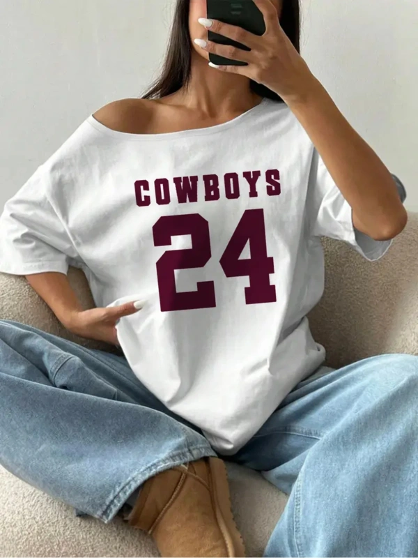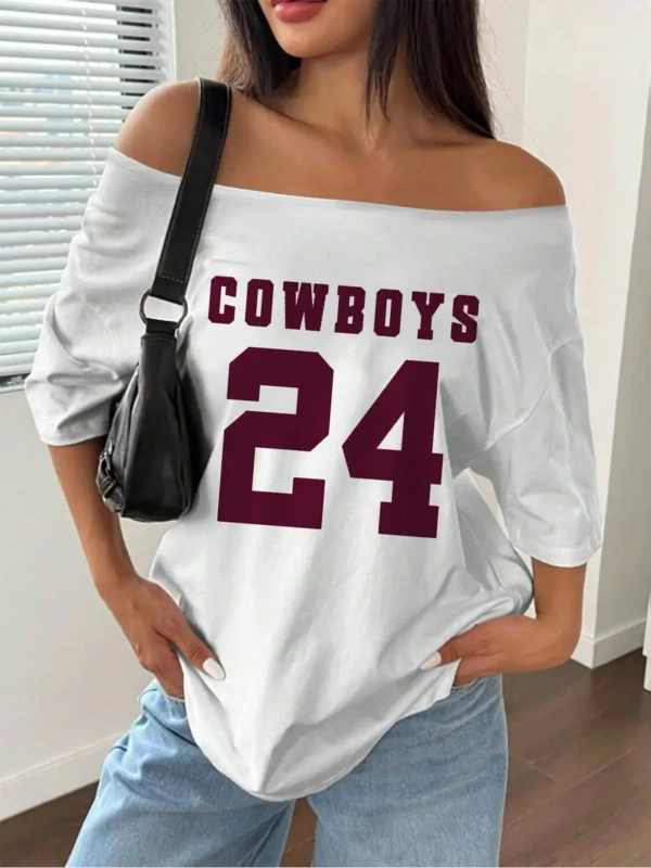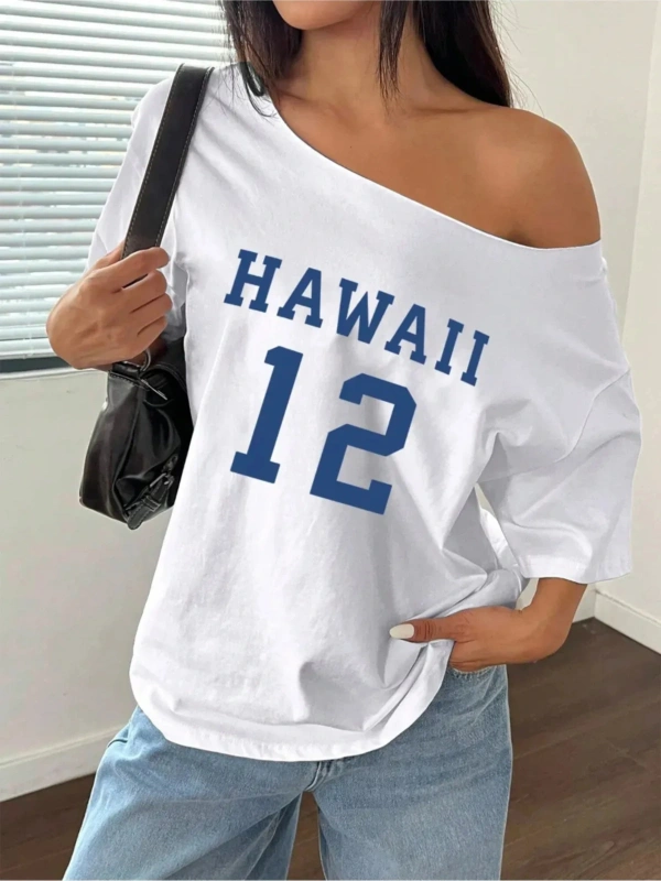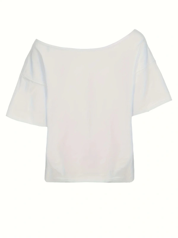 Beyaz Kadın Düşük Omuz Kayık Yaka Oywouos 33 Baskılı