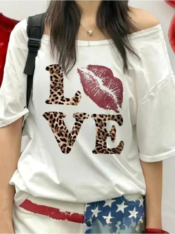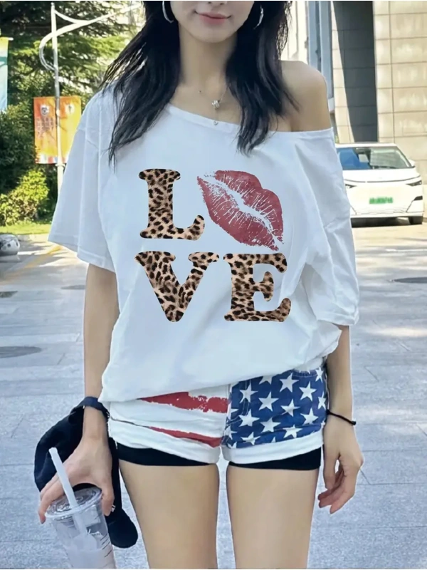 Beyaz Kadın Düşük Omuz Kayık Yaka Dudak Baskılı