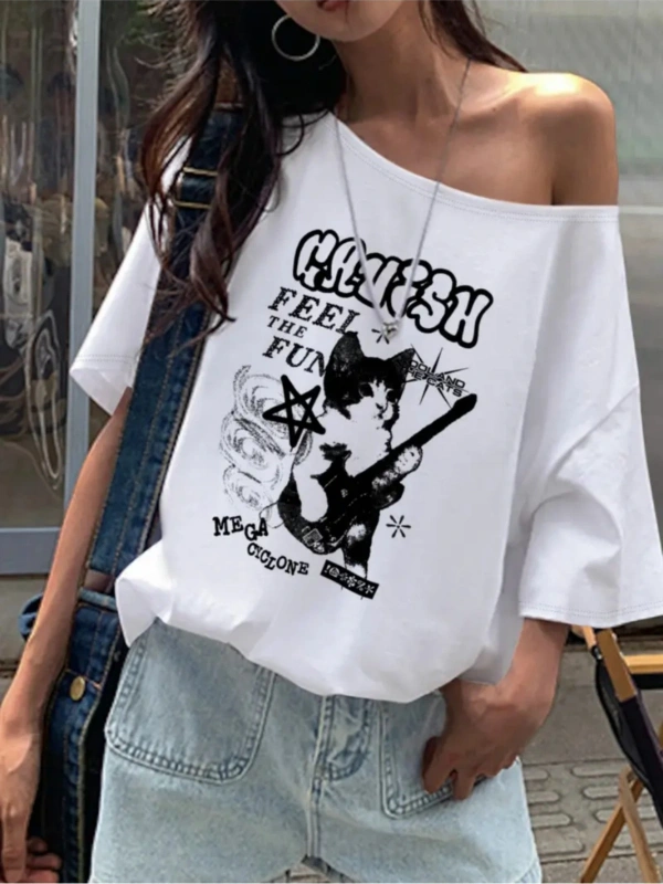 Beyaz Kadın Düşük Omuz Kayık Yaka Feel Fun Baskılı