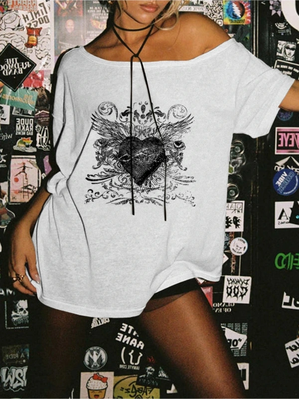 Beyaz Kadın Düşük Omuz Kayık Yaka Kalp Kanat Baskılı