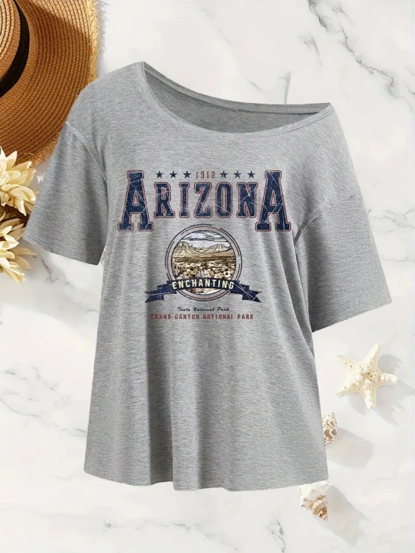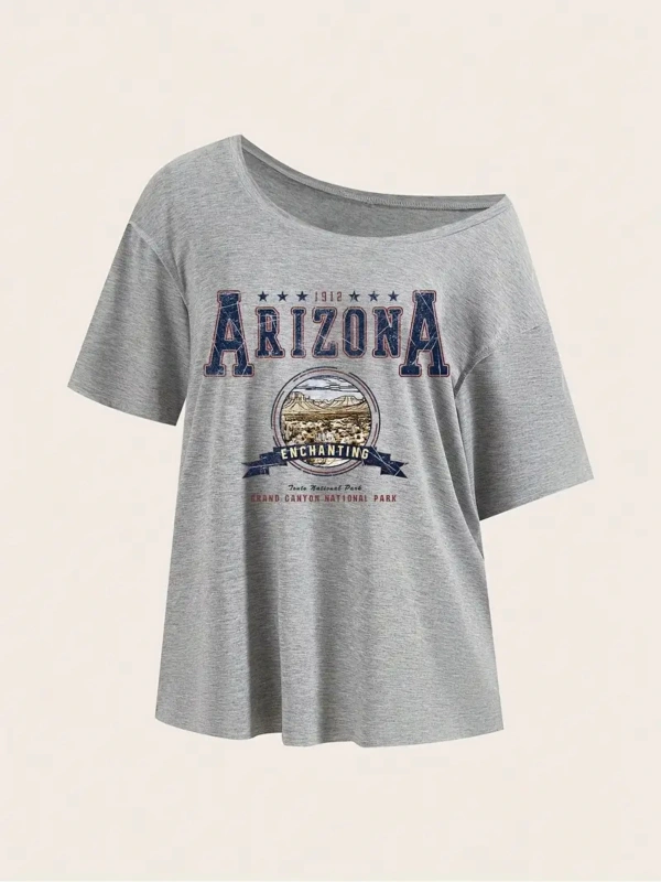 Gri Kadın Düşük Omuz Kayık Yaka New York 52 Baskılı
