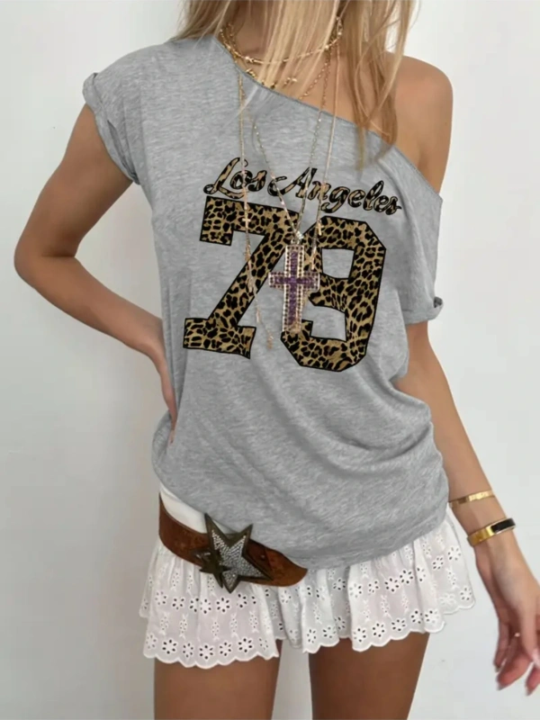 Gri Kadın Düşük Omuz Kayık Yaka Leopar 79 Baskılı