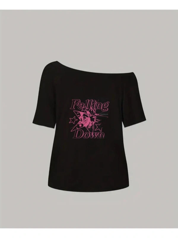 Siyah Kadın Düşük Omuz Kayık Yaka Falling Down Baskılı