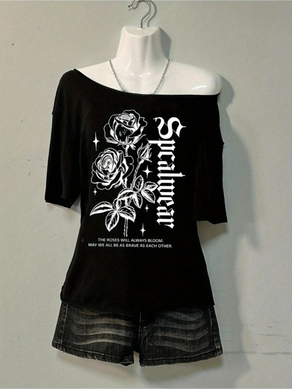Siyah Kadın Düşük Omuz Kayık Yaka Gül Simgesi Baskılı