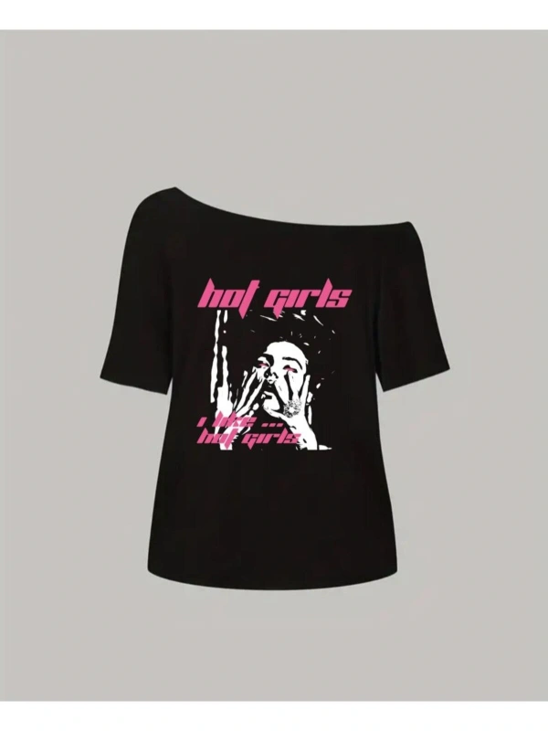 Siyah Kadın Düşük Omuz Kayık Yaka Hot Girls Baskılı