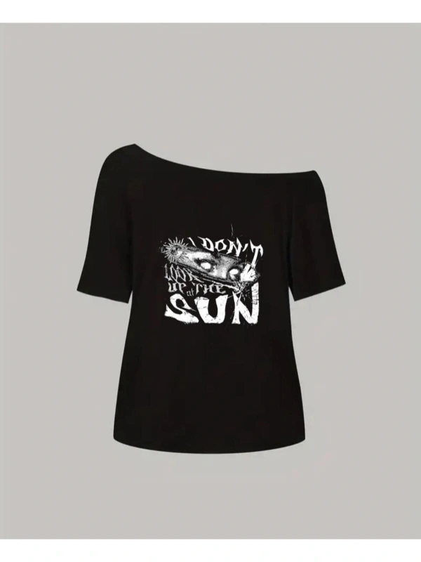 Siyah Kadın Düşük Omuz Kayık Yaka I Dont Sun Baskılı