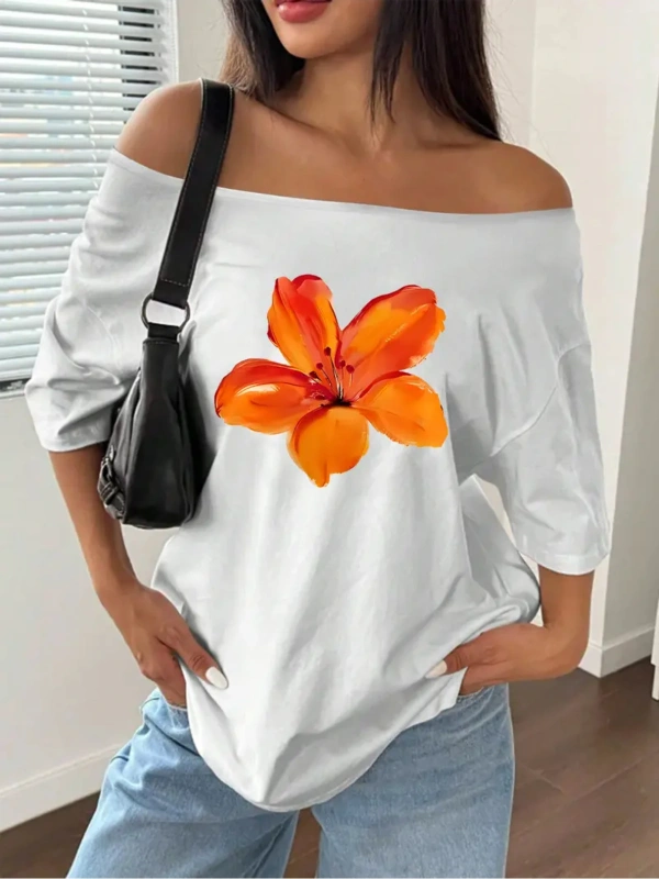 Kadın Düşük Omuz Kayık Yaka Baskılı